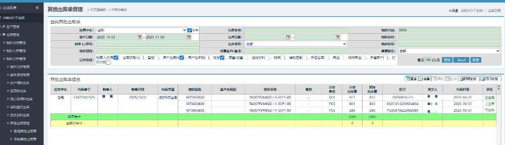 点晴ERP-查询委外工单发料的出库单号-操作教程 点击进入如下图:填上委外单号再点击查询,就有该工单的出库单号如下图: