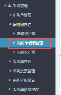 进入ERP系统之后,在左侧的功能菜单里找到“采购管理”,点开“询价单管理”,点击“询价单明细管理”。