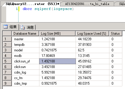 查询分析器执行命令: dbcc sqlperf(logspace)