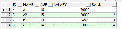 结果:结果中 rank 的序号,其实就表明了 over(order by salary desc) 是在where age between and 后执行的