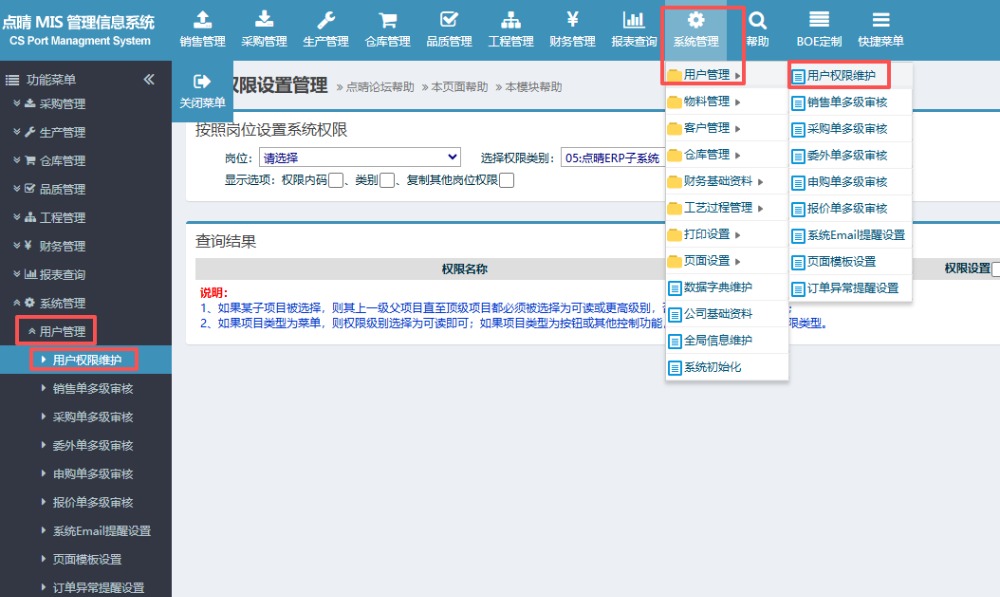 请问如何对点晴ERP/OA/PMS/WMS/进销存等系统中所有用户岗位根据菜单来查看或一次性批量设置权限?