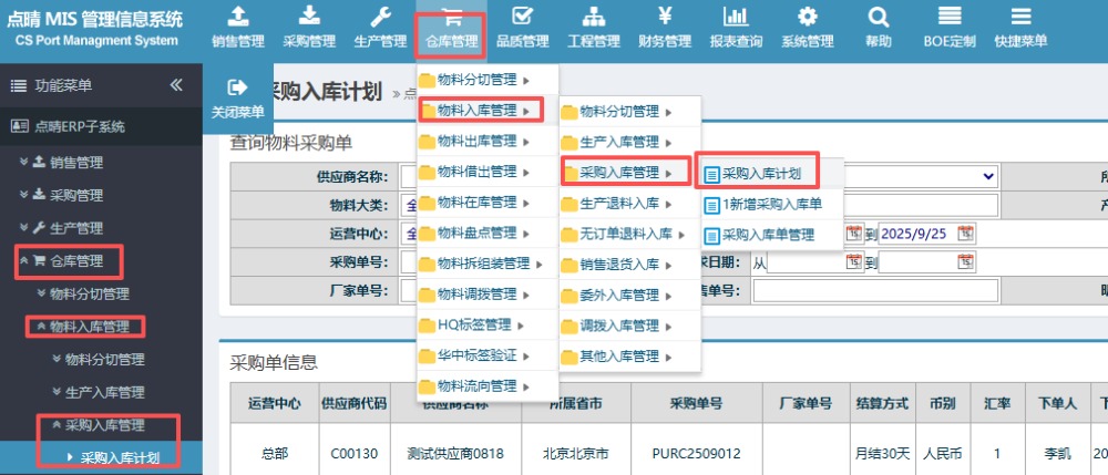 点晴模切ERP-采购入库计划操作流程
