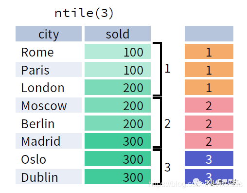 • NTILE(), 将分区内的数据分为 N 等份,为每行数据计算其所在的位置。