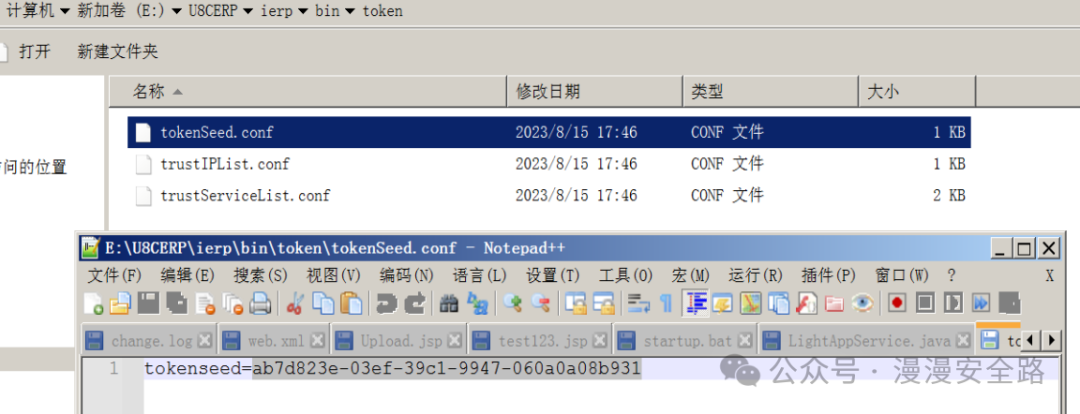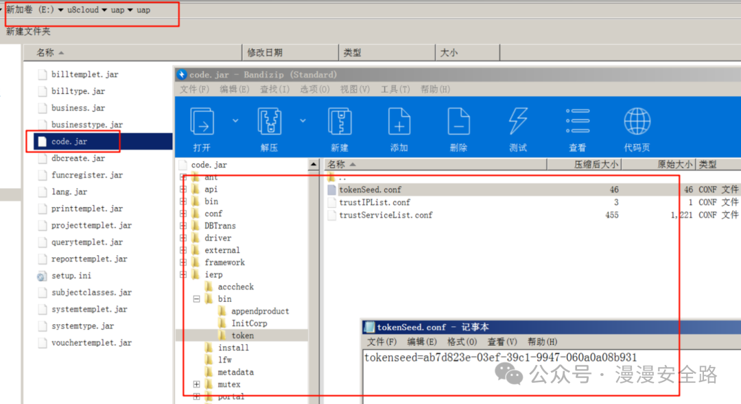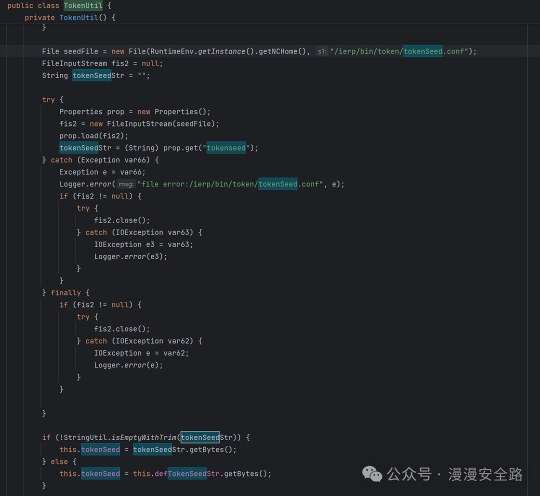nc.bs.framework.server.token.TokenUtil可知tokenSeed储存在/ierp/bin/token/tokenSeed.conf里我们直接查看安装包和安装后的这个文件发现没有任何变化说明是硬编码的不是启动后随机生成写入文件的。