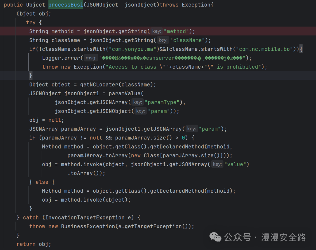 我这个代码是修复了这个漏洞以后的加了包名限制。这里其实和我们上面反射调用方法是一样的只不过这里是json格式上面是反序列化。所以我们看下"method":"uploadFile","className":"nc.itf.hr.tools.IFileTrans"修复了没还是只加了包名限制反射调用。