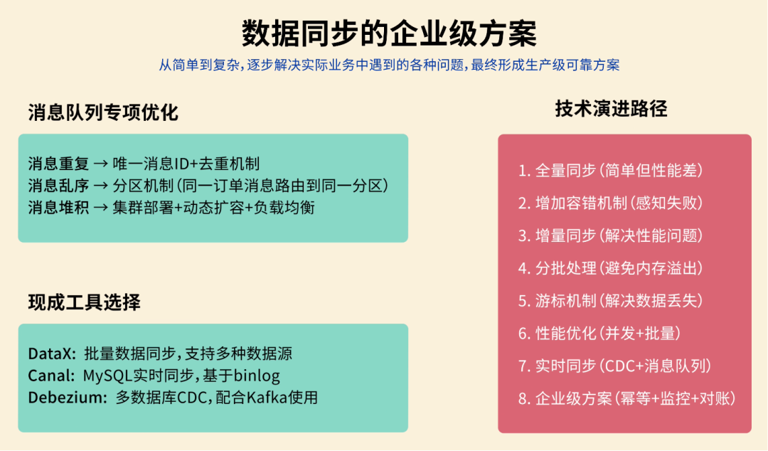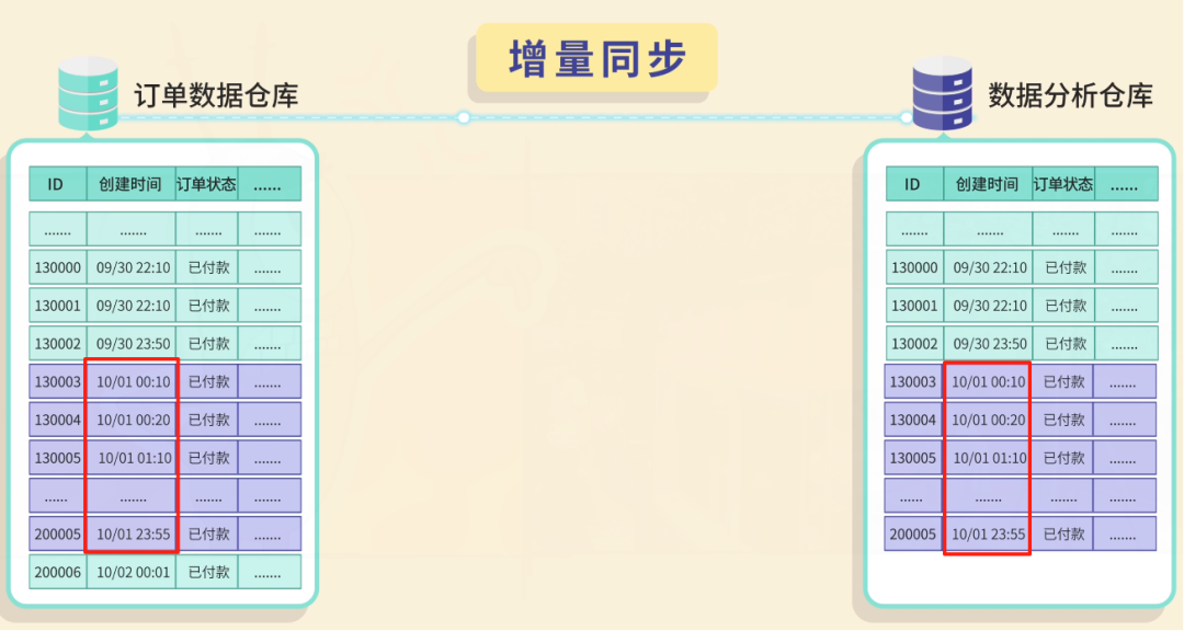 全量同步什么是数据同步呢?就像你有两个手机,要把其中一个手机的照片复制到另一个手机里。数据同步就是把一个数据库的数据,定期复制到另一个数据库里。 你心想:这还不简单吗?我写个定时任务,每天 把整个订单表的数据 全部查出来,然后 一股脑插入 到数据仓库! ![]() 这种方法叫 全量同步,不管数据有没有变化,每次都把所有数据重新复制一遍,简单粗暴。 第一天,公司有 1 万条订单数据。你的程序跑了 3 个小时,同步成功! 老板看着数据夸到:不错啊小阿巴,开发神速啊! ![]() 你内心暗爽:高端的功能往往只需要最简单的代码。 ![]() 基础告警第二天一早,你还没到公司,就收到了运营小姐姐的夺命连环 call:“小阿巴!出大事了!昨天晚上的数据同步失败了,现在老板还没看到昨天的数据,他正在会议室发火呢!” ![]() 你意识到:现在的程序是不可靠的,如果因为网络等原因同步失败了,可能要到第二天才会发现。 于是你给程序加了一段逻辑:如果同步失败,会记录错误日志,同时发邮件通知管理员,并且把数据库回滚到同步前的状态。 ![]() 这样如果出了问题,你会比老板先发现,手动重新执行一遍同步任务就好。 增量同步过了几天,老板黑着脸找你了:“小阿巴,为什么今天数据还没同步完?” 你看了下订单数据,立刻发现了问题。现在有 10 万条数据,程序跑了 30 个小时还没结束;这样下去,如果有 100 万条数据,估计要 300 个小时! 老板:少废话,快点解决,不然送你到隔壁餐饮部沉淀沉淀。 ![]() 你开始思考:既然全量同步太慢,那我只同步每天新增的订单不就行了? ![]() 这就是 增量同步,约定每天 0 点执行同步任务,只同步昨天 0 点之后创建的订单。 ![]() 这样大大减少了每次同步的数据量,任务的执行时间不再线性增加了。 但很快,你发了一个问题,订单的状态是会发生变化的,比如用户付款后又退款。 如果使用订单创建时间作为增量同步的分界标志,只能同步新增的订单,但是订单状态的更新不会同步! ![]() 于是,聪明的你使用 updated_time 字段进行增量同步,这个字段会在每次数据变化时自动更新。 ![]() 这样新增和修改的数据都能同步了! 你内心窃喜:聪明如我小阿巴,老板夸我好开发。 ![]() 批处理过了几天,公司搞了一波大促活动,当天订单量比平时多了几倍,老板请大家通宵狂欢开 party。 结果正在你欢唱 “只因你太美” 的时候,突然公司的运维大叫:不好了不好了,我们的项目服务器卡死了,用户无法下单! 你看了看时间,0 点多,不正是数据同步任务的执行时间么?你瞬间汗流浃背,放下麦克风,赶回公司修 Bug。 原来是因为一次查询出来的订单数据太多了,都加载到内存,导致服务器 OOM 内存溢出了。 ![]() 你悔不当初:唉,早该想到这个问题,既然单次处理数据量太大有风险,那我就 分批处理。 每 100 条数据为一批,每次只从数据库中分页查询出这一批数据,同步完这一批,再执行下一批。 ![]() 这样每次只处理少量数据,内存压力小;而且如果某一批处理失败,只需要回滚和重新同步这一批,而不是全部重来。 问题算是解决了,但是今夜你彻夜难眠,你似乎成了公司业务增长后,唯一不开心的那个人。 ![]() 希望今后不会再遇到这种闹心事了吧。 游标机制但生活总是这样,屋漏偏逢连夜雨。两天后,你又收到了老板的咆哮:“狗阿巴,这就是你做的数据同步?你自己看看丢了多少数据!” 你大惊,丢失数据?不应该啊。。。 经过仔细排查,你发现了问题:如果在分页查询的过程中,有新的数据被插入或更新,就会导致数据偏移和丢失! 比如查询第 1 页时,符合条件的订单有 4 条: 执行第 1 页查询,每页 2 条,偏移量为 0: 查询结果返回订单 A(08:00)和订单 B(09:00),同步完成后将偏移量调整为下一页 可就在查询下一页前,订单 B 因为 “修改订单状态” 被更新,这时订单 B 的更新时间就不在查询范围内了。 这就导致查询下一页 ![]() 怎么解决这个问题呢? 这可难不倒你小阿巴,既然 动态数据集 中使用 SQL 自带的 OFFSET 偏移作为分页起点会出问题,那不妨 自定义一个标志来记录下一批要同步的起点。 这就是游标机制。 比如我约定自增的主键 id 作为游标,每查询一批数据之后,把这批数据的最后一条记录作为新的游标值;查询下一批数据时,只查询 id > 游标的数据。 ![]() 这样不仅防止数据丢失,还避免了 OFFSET 深度分页带来的性能问题。 此外,如果把游标想象成进度条的断点,可以更清晰地记录同步进度,失败后可以从断点继续。 做完这一通优化后,你长吁了一口气,工作看来是保住了。 ![]() 性能优化你以为终于可以安稳一段时间了。但没想到,公司的好日子才刚刚开始。 随着老板大力扩张业务,公司每天的订单量可以达到百万条,你的同步任务每次要跑几个小时才能完成。 更要命的是,老板现在对数据的依赖越来越强,要求每隔 2 个小时就要同步一次数据! 怎么能够让任务执行更快呢? 这时,你想起了曾经在 程序员面试神器 - 面试鸭 上背过的各种性能优化八股文。好家伙,终于能派上用场了! ![]() 首先,修改插入数据库的操作方式。之前是一条一条地插入订单数据,改为执行一条批处理语句来同时插入同一批内多个订单数据,减少了跟数据库通信的次数,性能大幅提升。 ![]() 但是你觉得还不够快,于是优化了批处理的流程。之前是等一批同步完再同步下一批,串行执行;现在你启动了多个线程,每个线程负