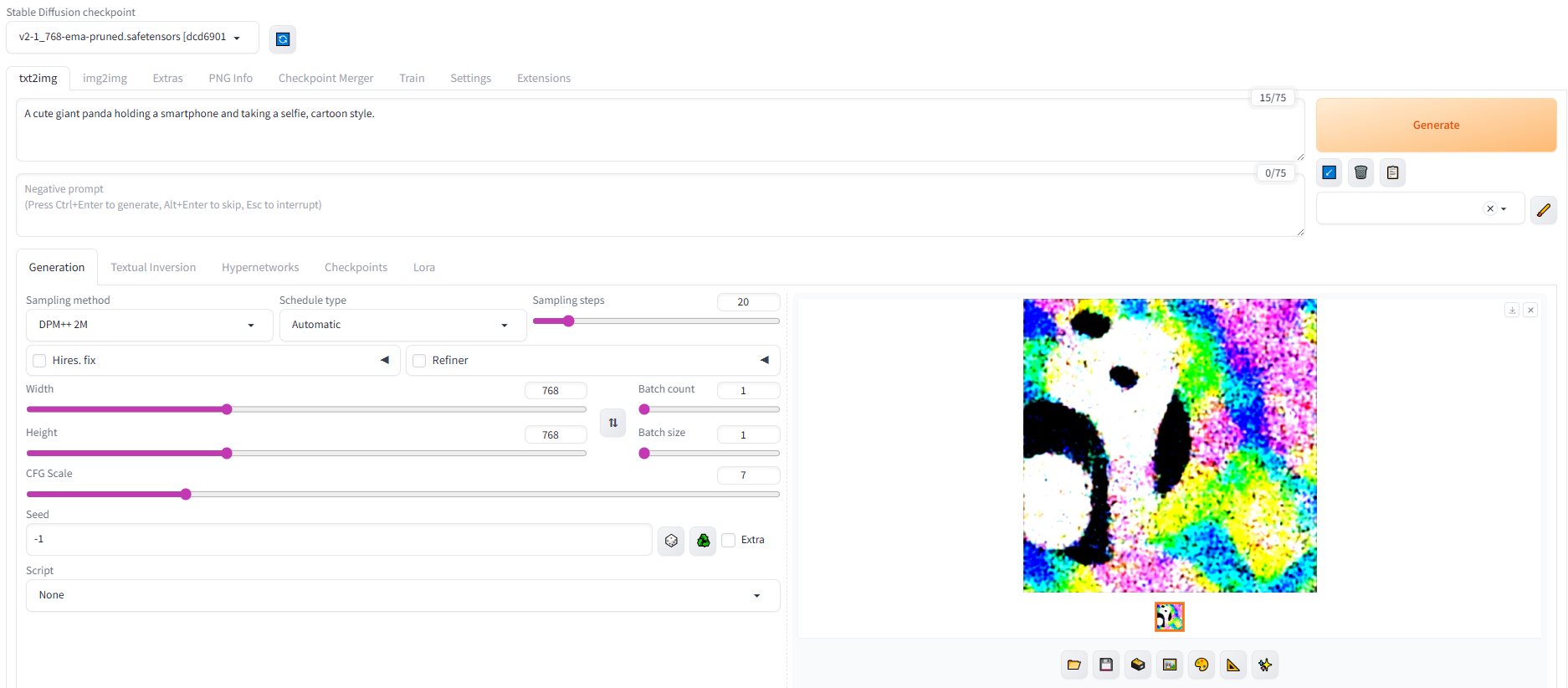 下载 文件v2-1_768-ema-pruned.safetensors 有点大5G。放到文件夹\stable-diffusion-webui\models\Stable-diffusion 中。 然后重启服务,刷新模板,重新生成。图片生成了,但是图像不对。