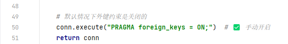 ⚠️ 注意:SQLite 默认 外键是关闭的,要显式打开: