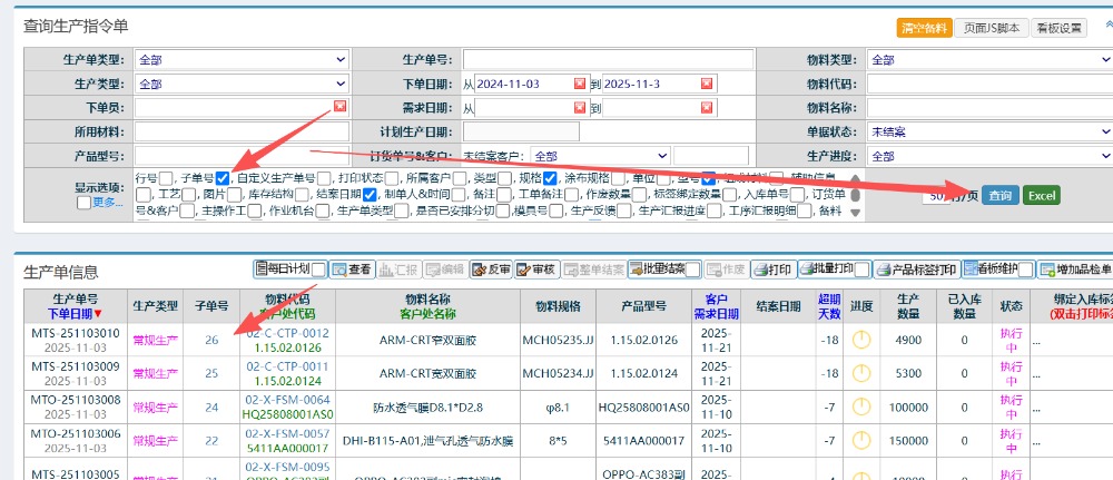 答:正常打印出来的生产工单号后面如果多了类似“-26”的情况那个是“子单号”,主要是用于后续批量发料操作的。 一般正常情况只需要看横杠前面的单号为准。 后续如果还有出现类似子单号的情况的话可以在生产工单的页面内取消勾选“子单号”进行查询。 点晴模切ERP更多信息:http://moqie.clicksun.cn,联系电话:4001861886 该文章在 2025/11/4 10:29:55 编辑过 |