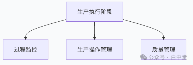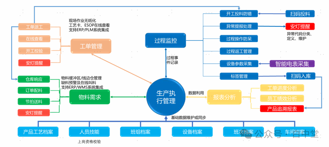 再进一步可按照颜色块和功能布局,把生产过程分为四大阶段,N个控制点。白中堂命名为:基础数据管理、生产准备、生产执行、产后分析。